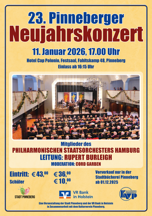 Ein musikalischer Jahresauftakt der besonderen Art: Starten Sie mit uns ins neue Jahr! Das traditionelle Neujahrskonzert der Stadt Pinneberg lädt Sie zu einem festlichen Abend voller klassischer Musik, glanzvoller Klänge und unvergesslicher Momente ein.