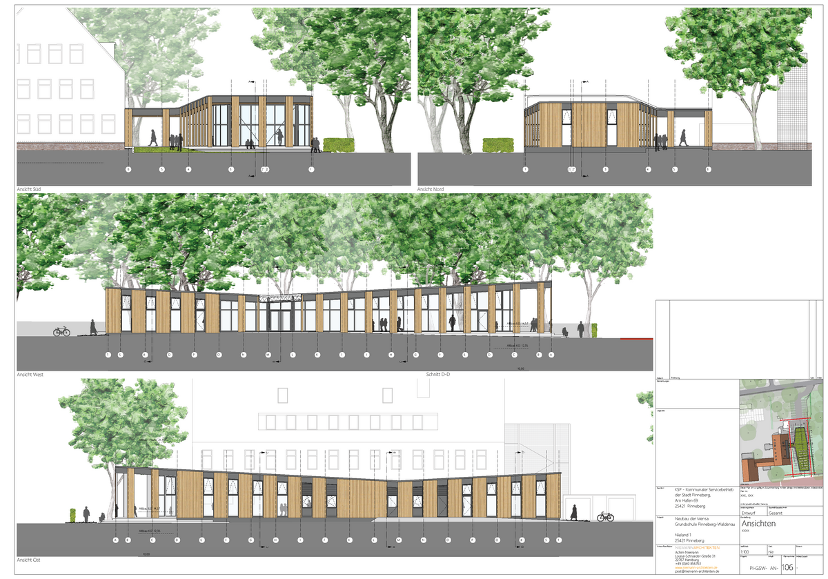 Entwickelt wurde dieser neue Mensa-Bau von dem Büro Niemann + Tiedgen Partnergesellschaft mbB aus Hamburg. Dieses wird das Projekt - unterstützt von Fachplanern für z. B. technische Ausrüstung oder Energieversorgung - auch umsetzen. Eng eingebunden sind dabei die Schule selbst, der Fachbereich IV der Stadtverwaltung sowie der Kommunale Servicebetrieb Pinneberg. Die Gesamtkosten belaufen sich auf 5,15 Millionen Euro – inklusive eines Pufferbudgets von 15 Prozent für Unvorhergesehenes und mögliche Preissteigerungen.