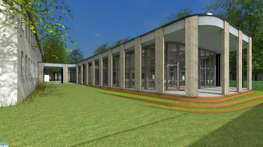 Neben einem großzügigen Speiseraum entsteht auch ein multifunktionaler Raum, der für vielfältige schulische und außerschulische Aktivitäten genutzt werden kann. Eine teilweise überdachte Terrasse schafft zusätzlichen Raum für Pausen und Veranstaltungen im Freien.
