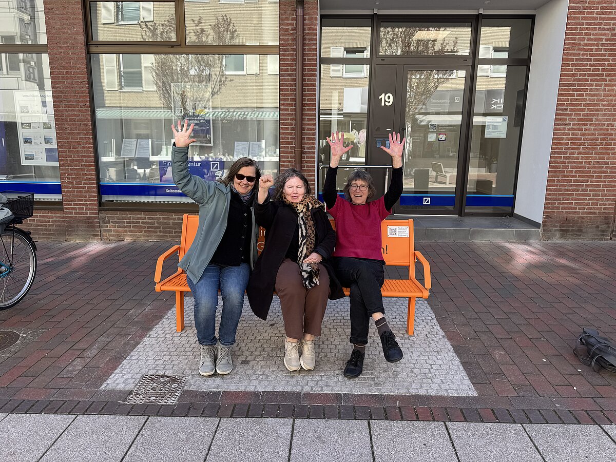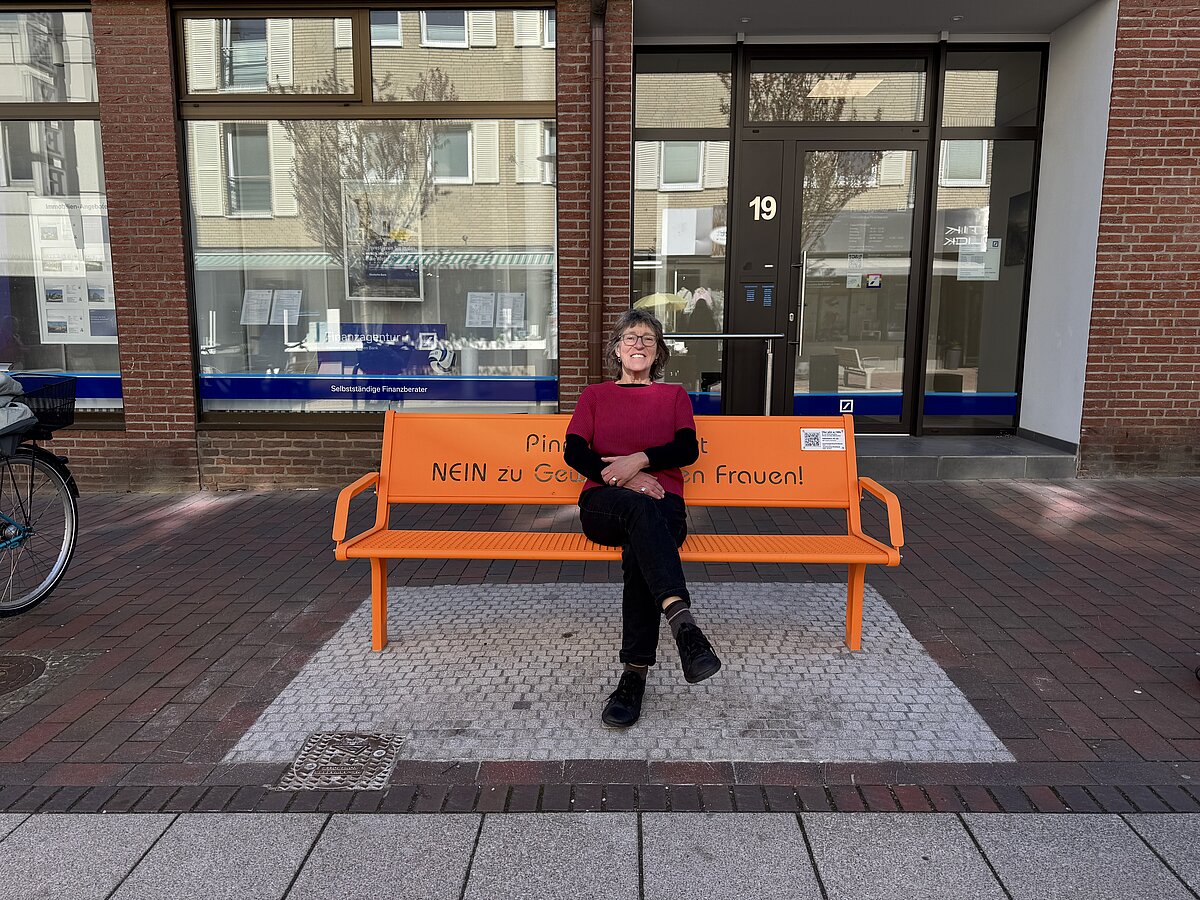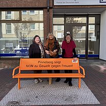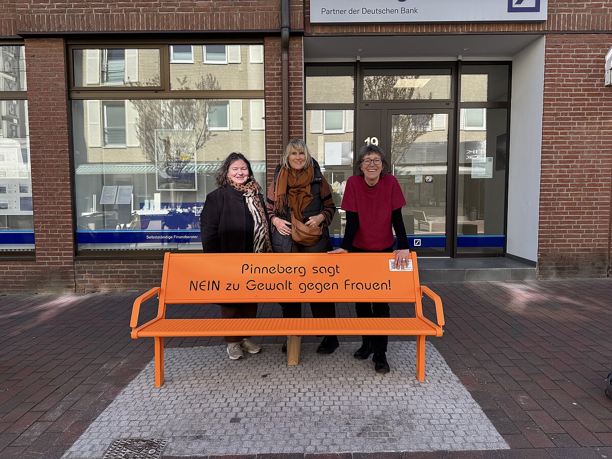 Am 25.11.2025, dem Internationalen Tag gegen Gewalt an Frauen, wurde die orangene Stahlbank mit dem eingravierten Statement „Pinneberg sagt NEIN zu Gewalt gegen Frauen“ während der Orange Days von unserem Bürgermeister Thomas Voerste feierlich eingeweiht. Sie steht jetzt in der Fußgängerzone in der Innenstadt.