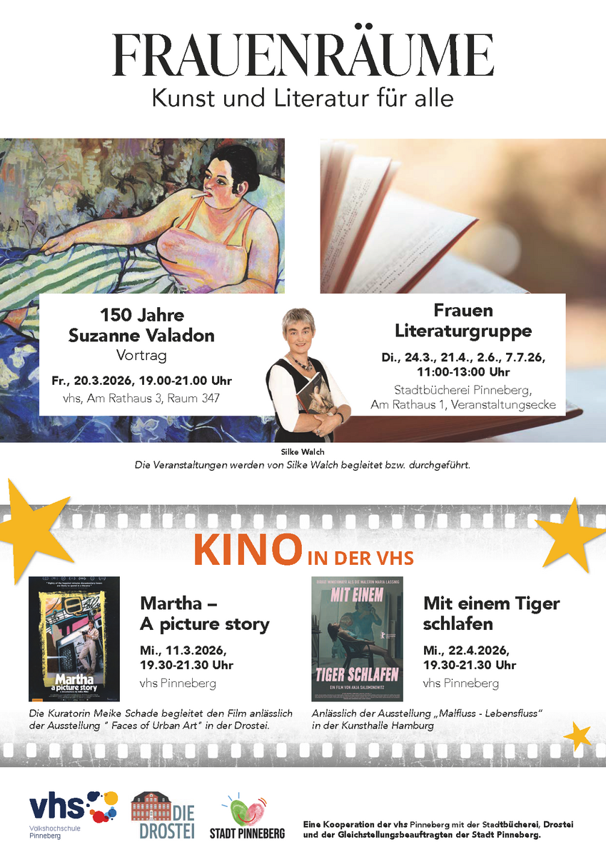 Frauenräume - Kunst und Literatur für alle“ ist eine Kooperation der vhs Pinneberg mit der Drostei, Gleichstellungsbeauftragten und der Bücherei der Stadt Pinneberg und freiberuflichen Kursleiterin für Kunst und Literatur von Frauen Silke Walch und der Kuratorin Meike Schade.