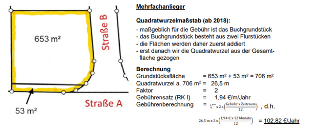 Bei diesem Maßstab haben deshalb Zufälligkeiten, die sich aus der Form der Grundstücke, ihrer Ausrichtung oder Lage zur Straße ergeben, keinen Einfluss auf die Gebührenhöhe. Der Quadratwurzelmaßstab macht die Grundstücke für die Gebührenberechnung vergleichbar.
