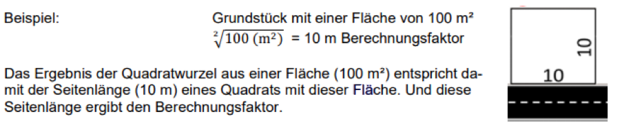 Das Ergebnis der Quadratwurzel aus einer Fläche (100 m²) entspricht damit der Seitenlänge (10 m) eines Quadrats mit dieser Fläche. Und diese Seitenlänge ergibt den Berechnungsfaktor. Der Quadratwurzelmaßstab ist aufgrund seiner Eigenart in besonderer Weise dazu geeignet, um die von der Rechtsprechung geforderte Einhaltung des allgemeinen Gleichheitssatzes zu gewährleisten. Das mathematische Verfahren ist präzise (Bestimmtheitsgebot) und kann auf (für den Gebührenpflichtigen) intransparente, manuelle Messvorgänge, Hilfs- und Projektionslinien verzichten.