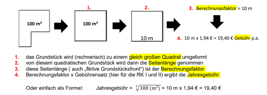 Die Gebühr beträgt jährlich je Quadratwurzelmeter Berechnungsfaktor in der