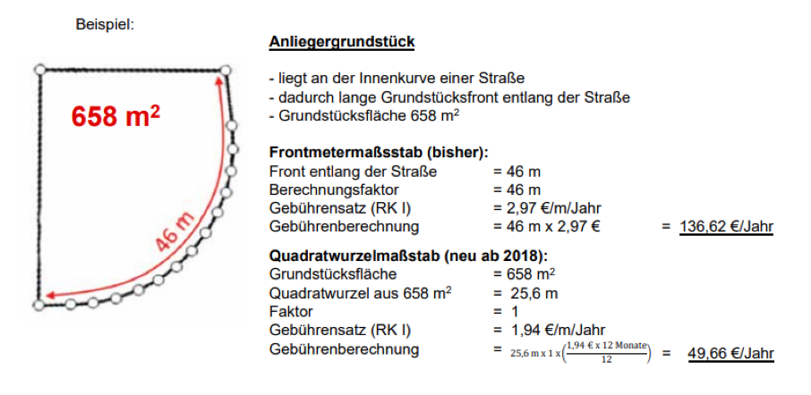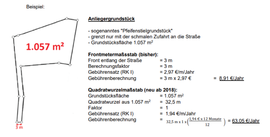 Durch den Wechsel auf den Quadratwurzelmaßstab haben Zufälligkeiten, die sich aus der Form der Grundstücke, ihrer Ausrichtung oder Lage zur Straße ergeben haben, keinen Einfluss mehr auf die Gebührenhöhe. Grundstücke beispielsweise, die bisher mit einer langen Seite an der Straße anlagen, werden zukünftig eine Gebühr zahlen, die mit gleich großen, aber eben anders geschnittenen Grundstücken vergleichbar ist.