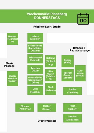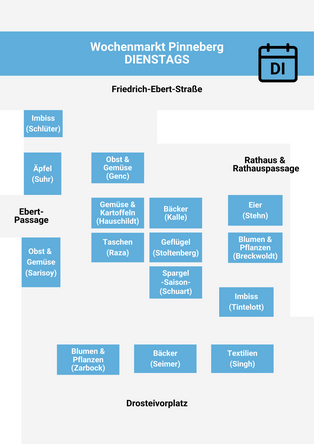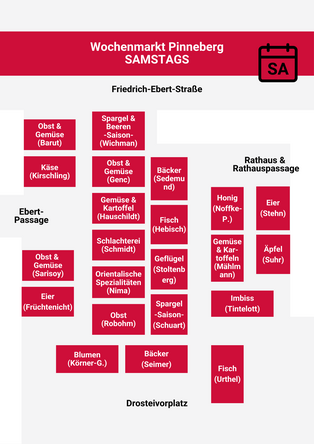 Jeden Dienstag, Mittwoch, Donnerstag & Samstag: Unser Wochenmarkt in Pinneberg findet dreimal die Woche mitten in der Pinneberger Innenstadt auf dem Rathausvorplatz und einmal die Woche in Waldenau statt.