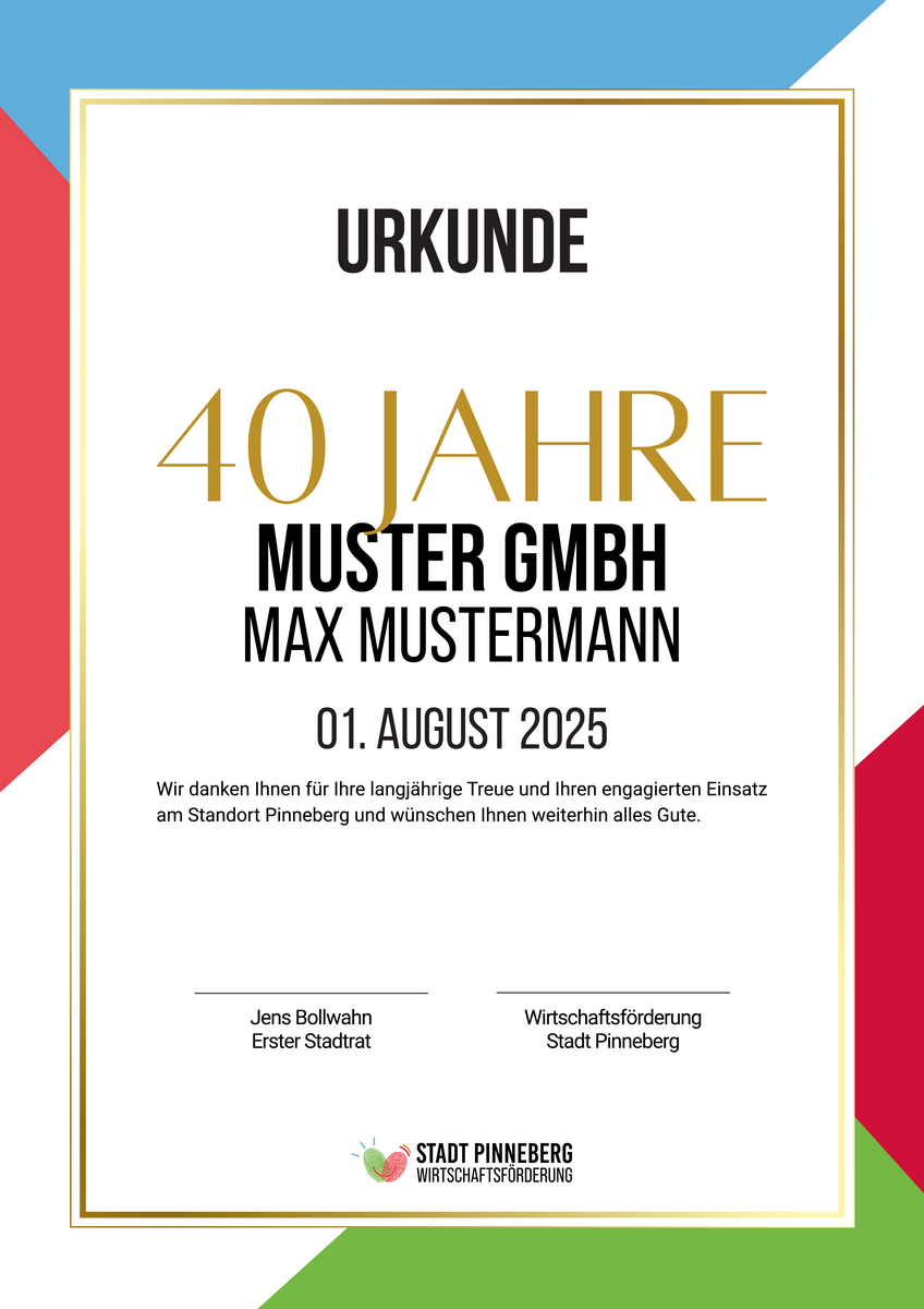 Langjährige Mitarbeit verdient Anerkennung. Die Stadt Pinneberg möchte Mitarbeitenden, die sich über viele Jahre in Unternehmen unserer Stadt engagieren, Wertschätzung entgegenbringen.